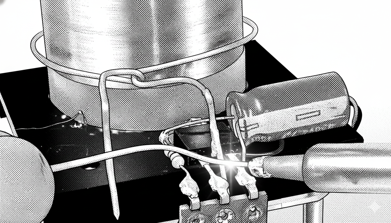 El corazón de la bobina son sus dos devanados. Cuando la corriente pasa por la bobina primaria (la de una sola espira gruesa), genera un campo magnético. Como este campo es oscilante (cambia muy rápido), "atraviesa" la bobina secundaria (las 700 vueltas de alambre fino) e induce en ella una corriente eléctrica.