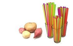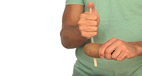 Pon una papa en la mesa o mostrador de la cocina y sostenla firmamente con una mano, asegurándote de que la palma de tu mano no está debajo de la papa.* Con un golpe rápido y fuerte mete la pajilla en la papa, mientras tapas con el dedo pulgar lael extremo de arriba de la pajilla. La pajilla debe penetrar la papa. Si no lo hizo prueba otra vez con otra pajilla, quizás más rápido o más fuerte.