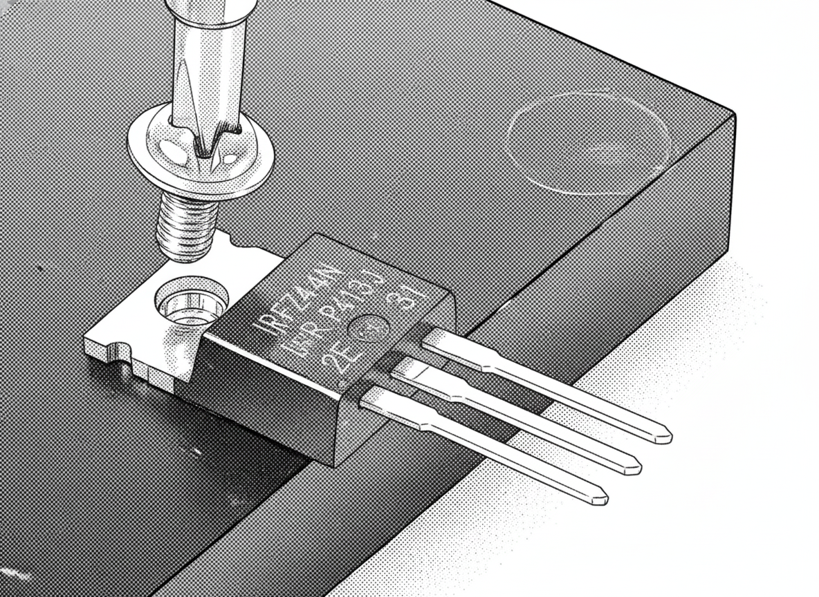 4.- Asegura el Mosfet en un disipador de calor con ayuda de un tornillo. Si fuera posible usa pasta térmica, que, como sabes es un material esencial para mejorar la transferencia de calor entre el transistor y el disipador, rellenando micro-huecos para disipar el calor generado, mejorando así el rendimiento y fiabilidad del Mosfet.