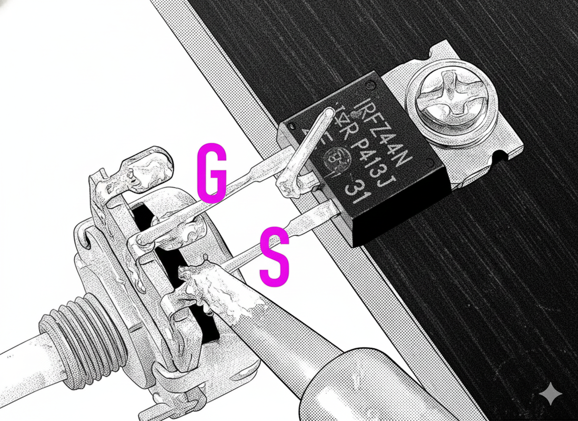 3.- Ahora debemos tomar el MOSFET IRFZ44N: Identifica los pines (Puerta, Drenador, Fuente).