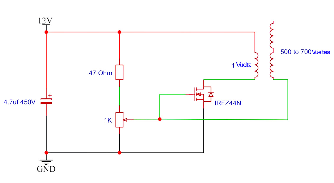 Oscilación: El circuito se "auto-oscila". Una pequeña parte de la energía de la bobina secundaria regresa a la "Puerta" (Gate) del MOSFET, diciéndole cuándo encenderse y apagarse.
