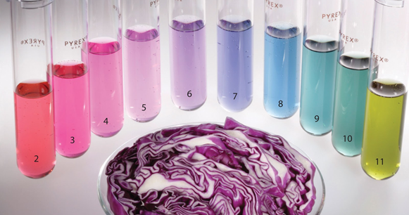 El Repollo morado o col lombarda contiene un pigmento llamado flavina (una antocianina). Este pigmento hidrosoluble también se encuentra en la piel de las manzanas, las ciruelas, las amapolas, los acianos y las uvas. Las soluciones muy ácidas tornan la antocianina de color rojo. Las soluciones neutras dan como resultado un color púrpura. Las soluciones básicas se tornan de color amarillo verdoso. Por lo tanto, se puede determinar el pH de una solución según el color que adquieren los pigmentos de antocianina en el jugo de repollo. El color del jugo cambia en respuesta a las variaciones en su concentración de iones de hidrógeno; el pH es el -log[H+]. Los ácidos donan iones de hidrógeno en solución acuosa y tienen un pH bajo (pH 7).
