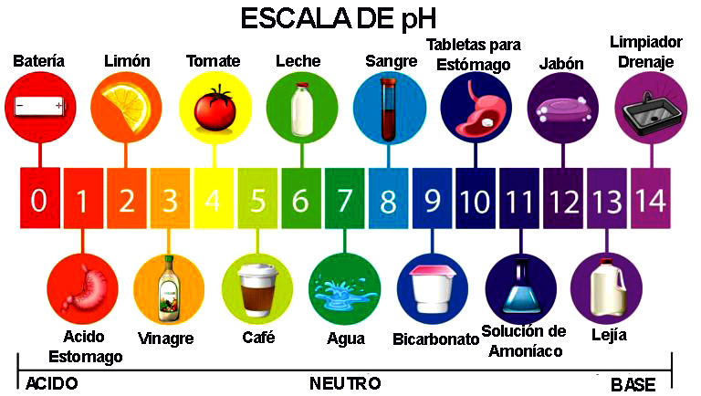Los químicos usan el pH para indicar de forma precisa la acidez o basicidad de una sustancia. Normalmente oscila entre los valores de 0 (más ácido) y 14 (más básico). En la tabla siguiente aparece el valor del pH para algunas sustancias comunes.